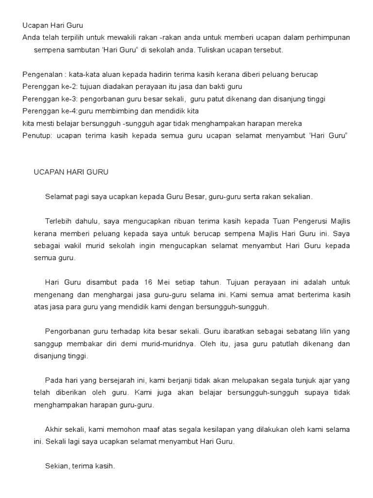 Salam sejahtera saya ucapkan kepada Yang Berusaha Tuan Guru BesarGuru Penolong Kanan. Terima kasih diucapkan kepada Tuan Pengerusi Majlis Tuan Pengetua Tuan Haji Zainuddin bin Loman guru cemerlang guru-guru dan rakan seperjuangan. Contoh Karangan Ucapan Sempena Hari Guru Salam sejahtera saya ucapkan kepada Tuan Guru BesarGuru Penolong Kananguru-guru dan rakan sekalianSaya sebagai wakil.